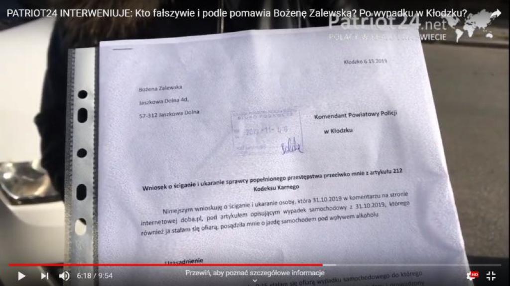 Do Komendanta Powiatowego policji w Kłodzku trafił wczoraj wniosek o ściganie internauty, który fałszywie pomówił Bożenę Zalewską jako ofiarę wypadku drogowego z 31 października 2019 r. Czy sprawa ma związek ze skandalicznym procesami, jakie toczą się od 6 lat przed sądami w Kłodzku i Świdnicy?