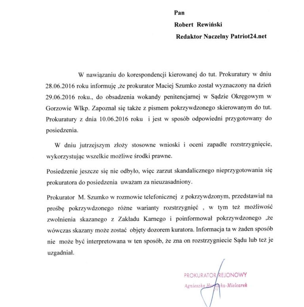 Takie skandaliczne zachowanie prokuratora wzbudziło natychmiast reakcję Patriot24.net. Wysłaliśmy pytania do rzecznika Prokuratury Okręgowej w Gorzowie Wielkopolskim. 10 minut później zadzwoniła do nas Prokurator Rejonowa z Gorzowa, której podlega prokurator Maciej Sumko i zapewniła, że sprawę natychmiast wyjaśni.